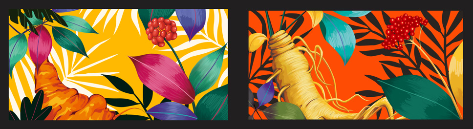 李華清項目團(tuán)隊翻閱了各種文化書籍,從《聆聽漢畫》中找到了靈感,發(fā)現(xiàn)漢畫的風(fēng)格大多都是浪漫渾樸,擴(kuò)大豪放的風(fēng)格,我們學(xué)習(xí)上面的繪制技巧和表現(xiàn)方法:畫面四周黑色邊框,猶如漢代歷史的大門,將我們帶入春天的百草園,去窺探神秘百草園的生長意境,感受撲面而來的自然芳香的本草氣息。