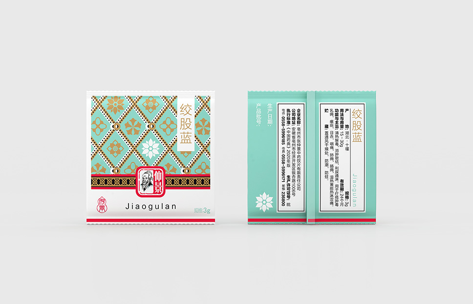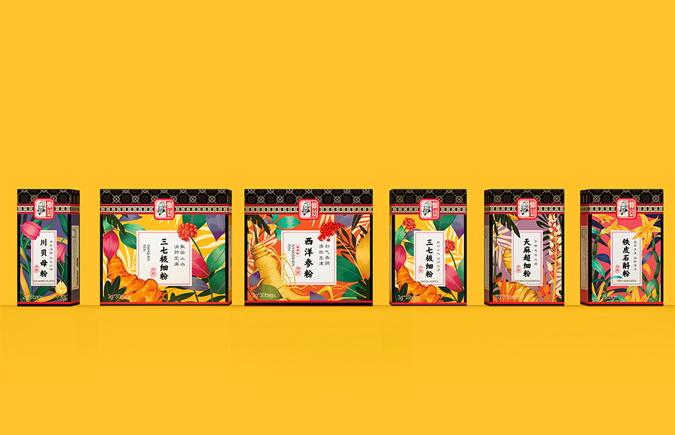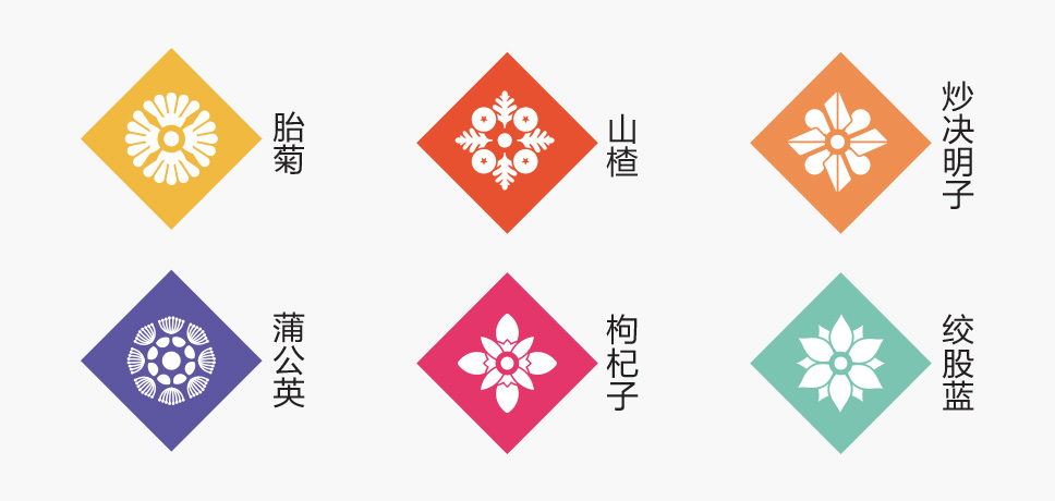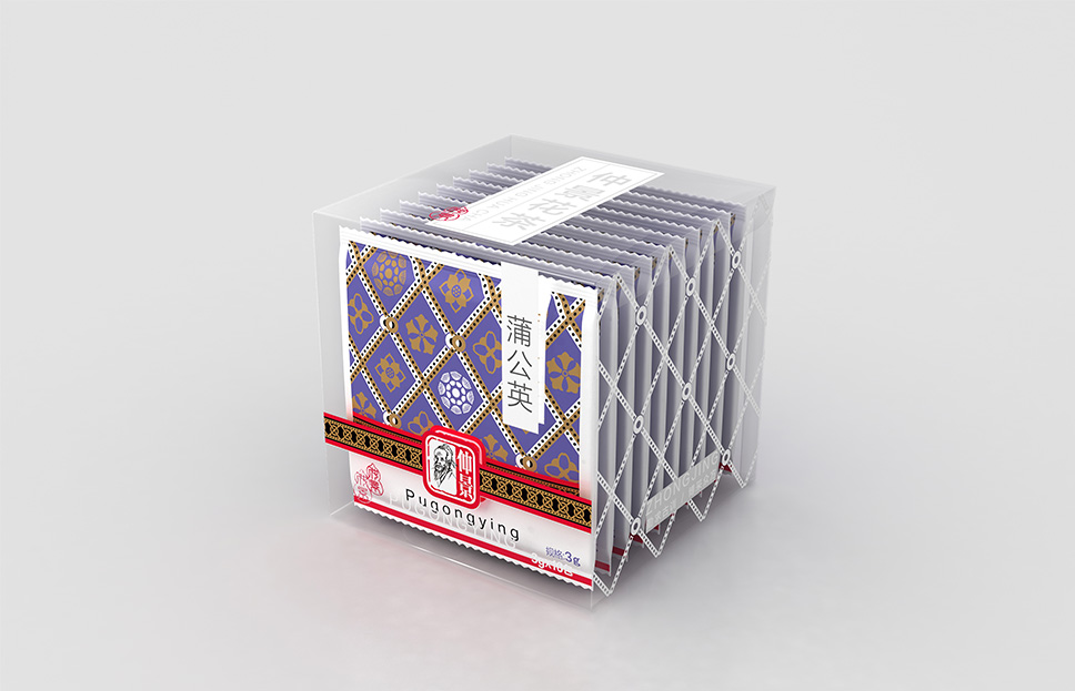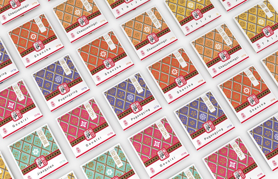 李華清項目團(tuán)隊在市場走訪中看到了中醫(yī)抓方配伍的場景,由此產(chǎn)生了靈感的聯(lián)想。我們運(yùn)用方勝紋與十字穿環(huán)紋結(jié)合衍生出抓方配伍場景凌霄花、茱萸花、柿蒂紋與產(chǎn)品進(jìn)行搭配,實現(xiàn)君臣佐使,和諧配伍。通過簡單有序的元素排列,形成專屬的仲景花茶戰(zhàn)略元素。